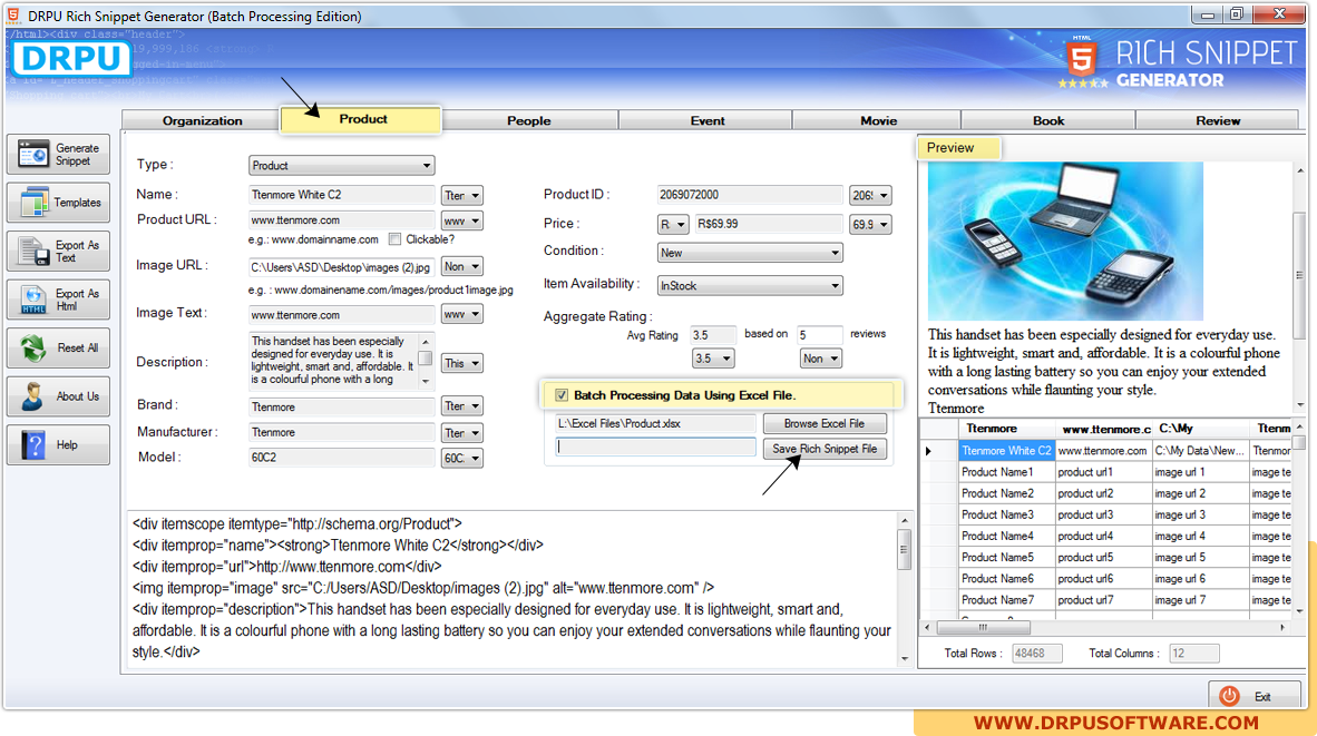 Click on “Product” tab then enter all required fields. Enable “Batch Processing Data Using Excel File” then browse Excel file and preview of each product with all details will display at right side of screen. Click on “Save Rich Snippet Files” for next step.