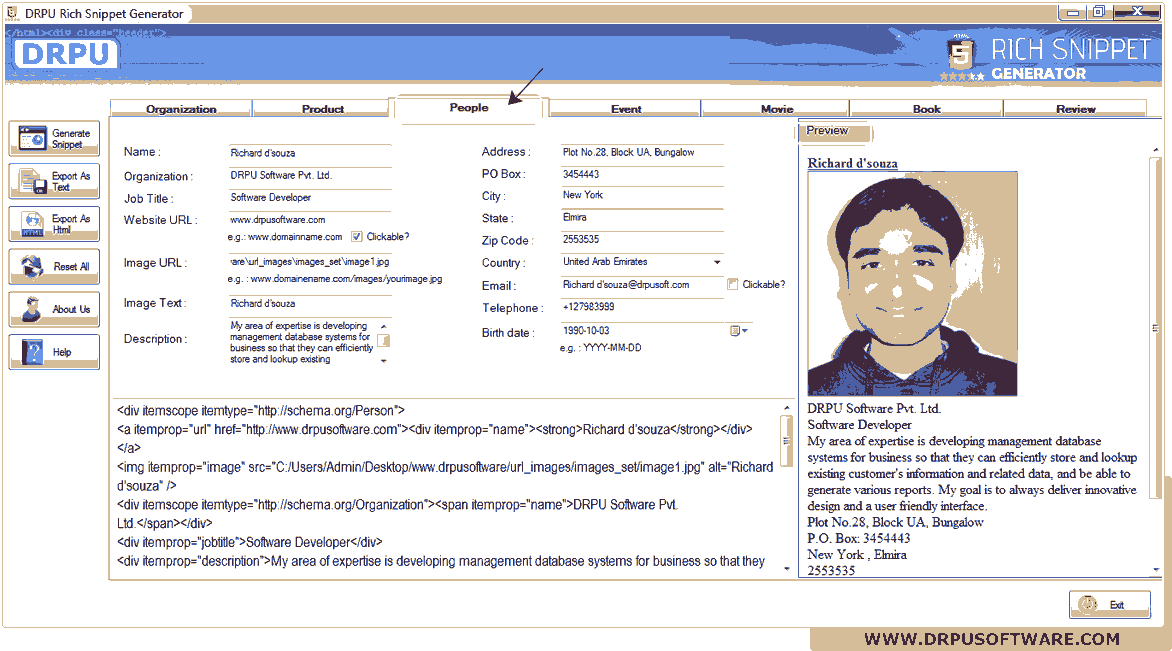 Click on “People” tab to add schema with particular person’s details. Preview is shown at right side of screen.